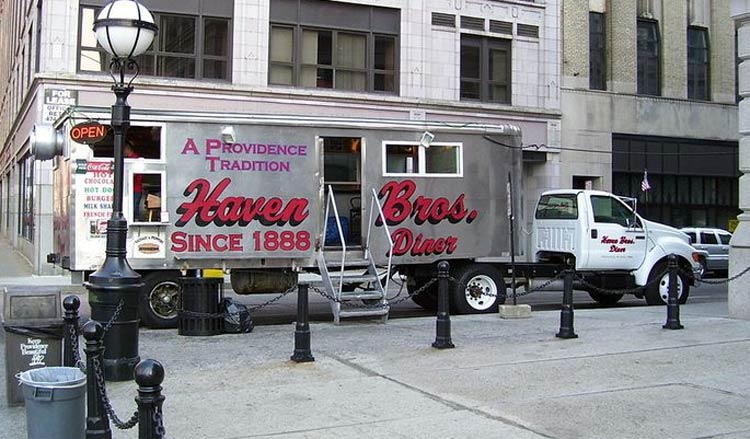 RAY: So there’s a white truck with kind of like a tow truck cab, and a flatbed behind it. The diner on the flatbed is maybe 30 feet long, stainless steel, like old-time diners, and a set of stairs that folds down to the sidewalk so you can walk inside. On the side of the diner it reads: A Providence Tradition. Haven Brothers Diner.